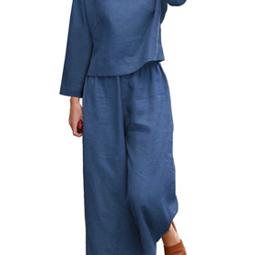 Damen lässiges Leinen-Langarm-Set mit weiten Hosen Amawinc
