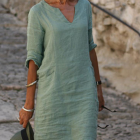 Dieses Leinenkleid verbindet ein luftiges Tragegefühl mit einem stilvollen Schnitt. Der V-Ausschnitt, die Dreiviertelärmel und die dezente Struktur des Stoffes sorgen für eine natürliche, elegante Ausstrahlung. Perfekt für verschiedene Anlässe, von lässig bis schick.