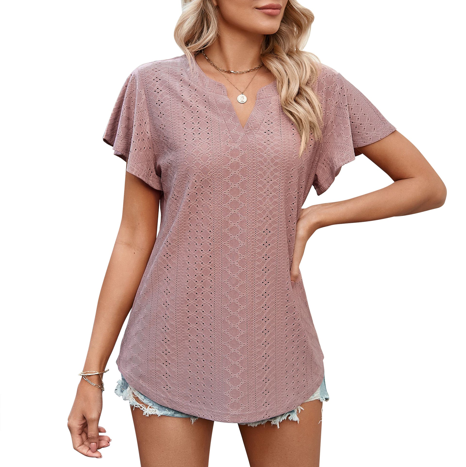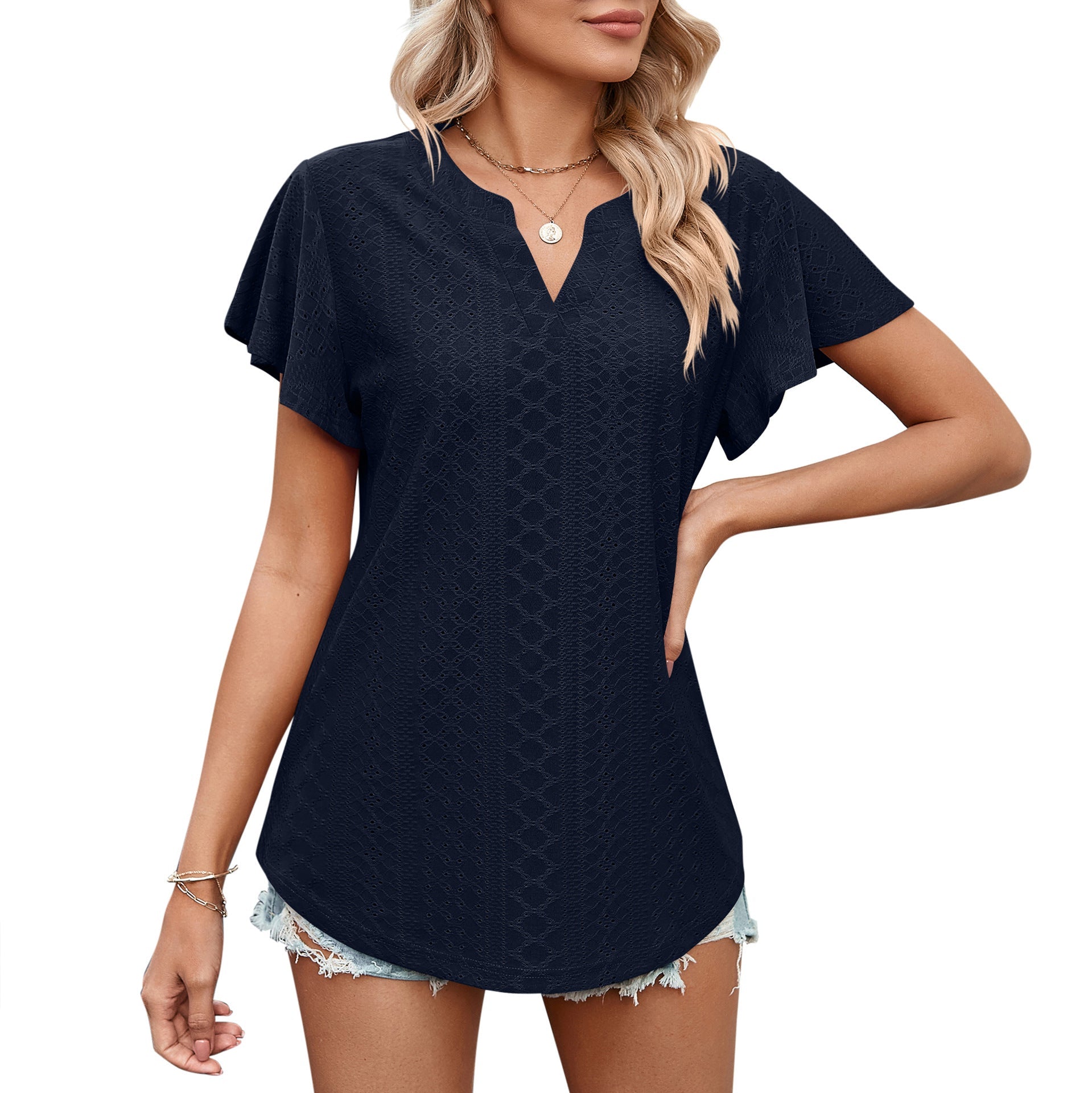 - Design: Charmantes Lochmuster mit eleganter V-Ausschnitt-Form, ideal für einen femininen Look.