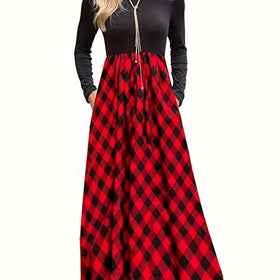Damen Maxikleid mit modernem Karomuster und langen Ärmeln Amawinc