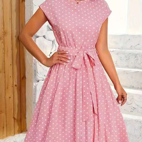 Damen Midikleid mit taillierendem Bindegürtel und verspieltem Polka-Dots Design Amawinc