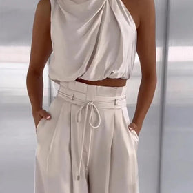 Donna vereint modischen Stil und angenehmen Tragekomfort. Das Ensemble aus locker geschnittenem Oberteil und elegantem Hosenanzug bietet zeitlose Klasse und ist ideal für anspruchsvolle Frauen, die Wert auf Komfort legen. Das Oberteil hat eine moderne, vorteilhafte Formgebung für einen femininen Look. Die weit geschnittenen Hosen setzen einen lässigen Akzent und unterstreichen die Eleganz.