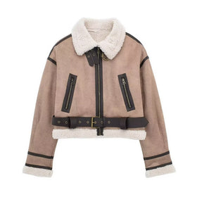 Damen modische Kurzjacke mit Schurwollkragen und Reißverschlusstaschen Amawinc