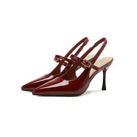 Diese burgunderroten Lackleder-Absätze verkörpern pure Klasse und Eleganz. Die spitz zulaufende Spitze und der dezente Absatz sorgen für einen zeitlosen, raffinierten Look, während die doppelten Riemchen für einen schicken und femininen Touch sorgen. Die tiefe, satte Farbe strahlt unaufdringlichen Luxus aus und passt perfekt zu klassischen und raffinierten Outfits.