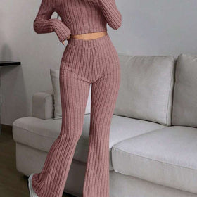 Entdecken Sie unser zeitgemäßes Damen Ripp-Strick-Zweiteiler-Set, das Komfort und Stil perfekt vereint. Dieser Ensemble besteht aus einem modischen, cropped Oberteil und passenden flared Pants, die für einen lässigen, aber dennoch eleganten Look sorgen.
