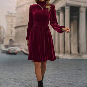 Damen Samtkleid mit hochgeschlossenem Design und eleganten langen Ärmeln Amawinc