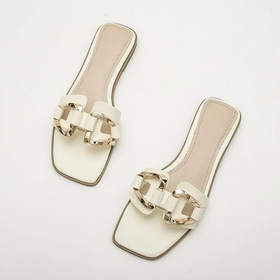 Diese eleganten Sandalen strahlen pure Raffinesse aus und passen perfekt zur Old Money Ästhetik. Die minimalistische, quadratische Zehenkappe und die subtilen goldenen Gliederdetails verleihen ihnen einen luxuriösen, zeitlosen Look, der mühelos schick aussieht. Die feine Verarbeitung und die neutrale Farbe machen sie vielseitig und stilvoll, ohne zu übertreiben.