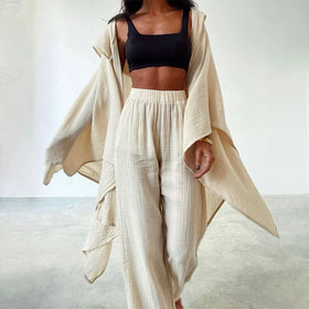 Cardigan und Hose mit weitem Bein – Komfort, Vielseitigkeit und moderner Stil vereint. Ergänzen Sie Ihre Garderobe mit diesem einzigartigen Ensemble für Bewegungsfreiheit und einen modischen Look.