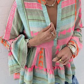 Das geometrische Damen-Shirt Miya wertet Ihre Garderobe auf. Es besticht durch einen V-Ausschnitt und lange, ausgestellte Ärmel für moderne Eleganz.