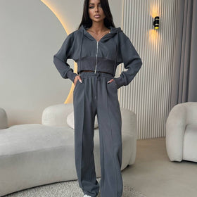 Damen sportliches Set aus cropped Kapuzenjacke und bequemen, lockeren Sporthosen Amawinc
