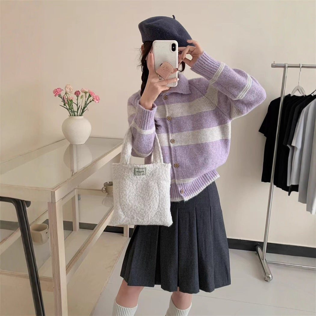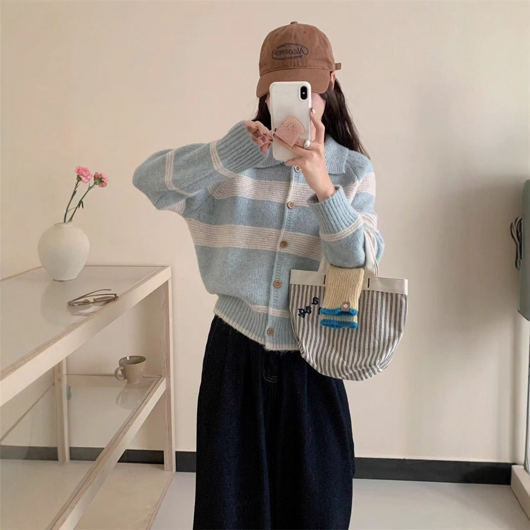 Damen Strickjacke mit charakteristischem Kragen und modischen Blockstreifen Amawinc