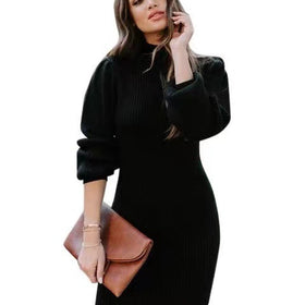 Damen Strickkleid mit hohem Kragen und Puffärmeln Amawinc