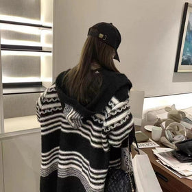 Dieser Damen Strickmantel verbindet Komfort und Stil in einem einzigartigen Design. Mit einer modernen Kapuze und einem attraktiven Streifenmuster ist dieses Kleidungsstück ideal für jeden Anlass.