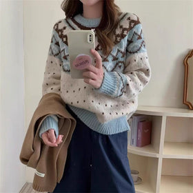 Damen Strickpullover mit grafischem Norweger-Muster und hohem Rundhalsausschnitt Amawinc