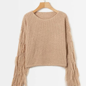 Damen trendiger Grobstrickpullover mit fransigen Ärmeln Amawinc