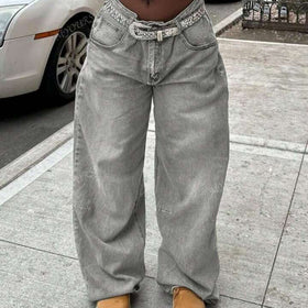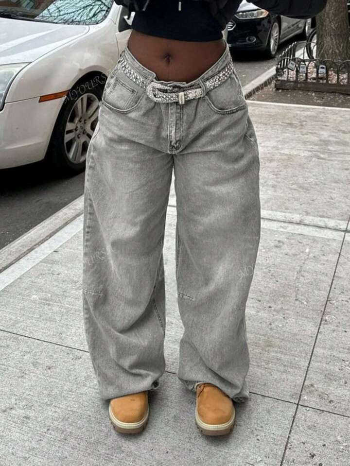 Damen Weit geschnittene Jeanshosen mit funkelndem Gürtel Amawinc