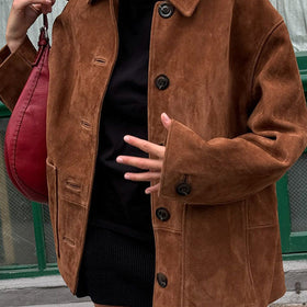 - Hochwertiges Material: Die Jacke ist aus feinem Veloursleder gefertigt, das sowohl robust als auch elegant ist.
