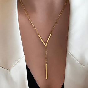 Diese goldene Y-Halskette strahlt schlichte Eleganz und moderne Raffinesse aus. Die minimalistische Form mit einem dezenten V-förmigen Anhänger und einem zarten, länglichen Anhänger betont das Dekolleté auf schicke und zeitlose Weise.