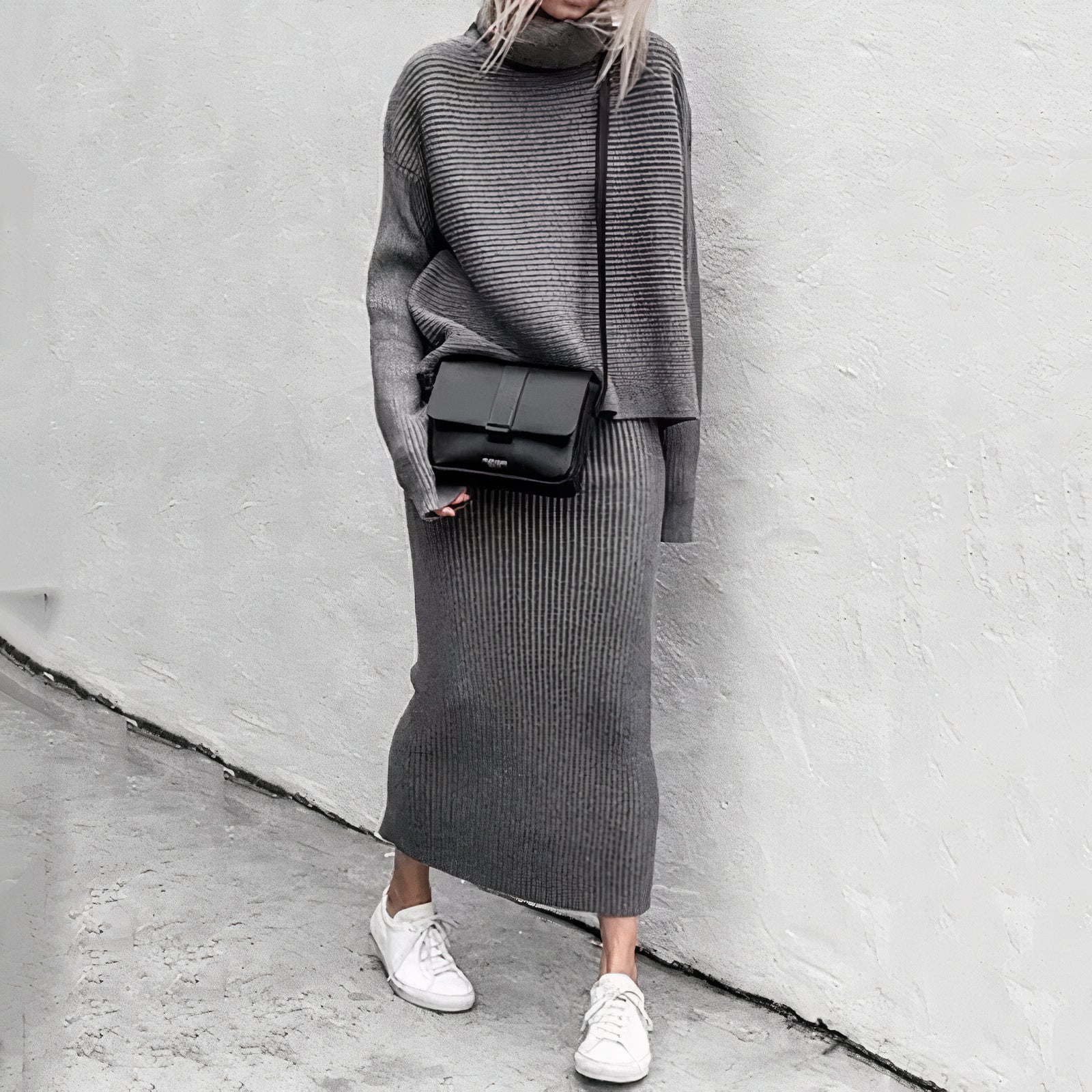 Dieses elegante Set aus Pullover und Rock vereint schlichte Eleganz mit absolutem Komfort und ist perfekt für die kalte Jahreszeit. Die weiche Strickqualität sorgt für ein gemütliches Tragegefühl, während das moderne Design zeitlosen Stil ausstrahlt. Perfekt für Herbst- oder Wintertage, lässt es sich mühelos stylen. Fühlen Sie sich wohl und sehen Sie gleichzeitig stilvoll aus.