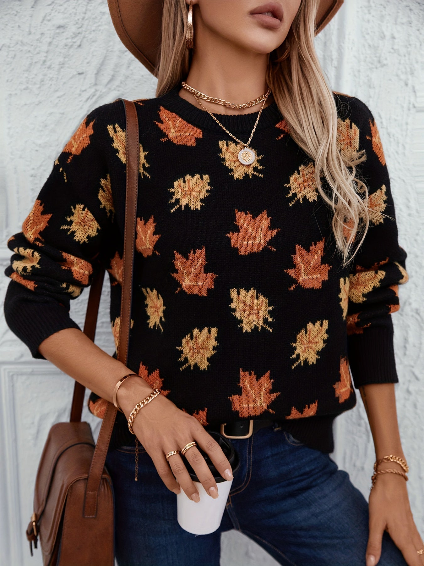 Dieser Rundhalsausschnitt-Pullover mit wunderschönem Ahornblattdruck fängt den Herbstgeist ein. Das weiche Polyester-Material und die lockere Passform machen ihn sowohl bequem als auch stilvoll, ideal für legere Looks an kühleren Tagen.