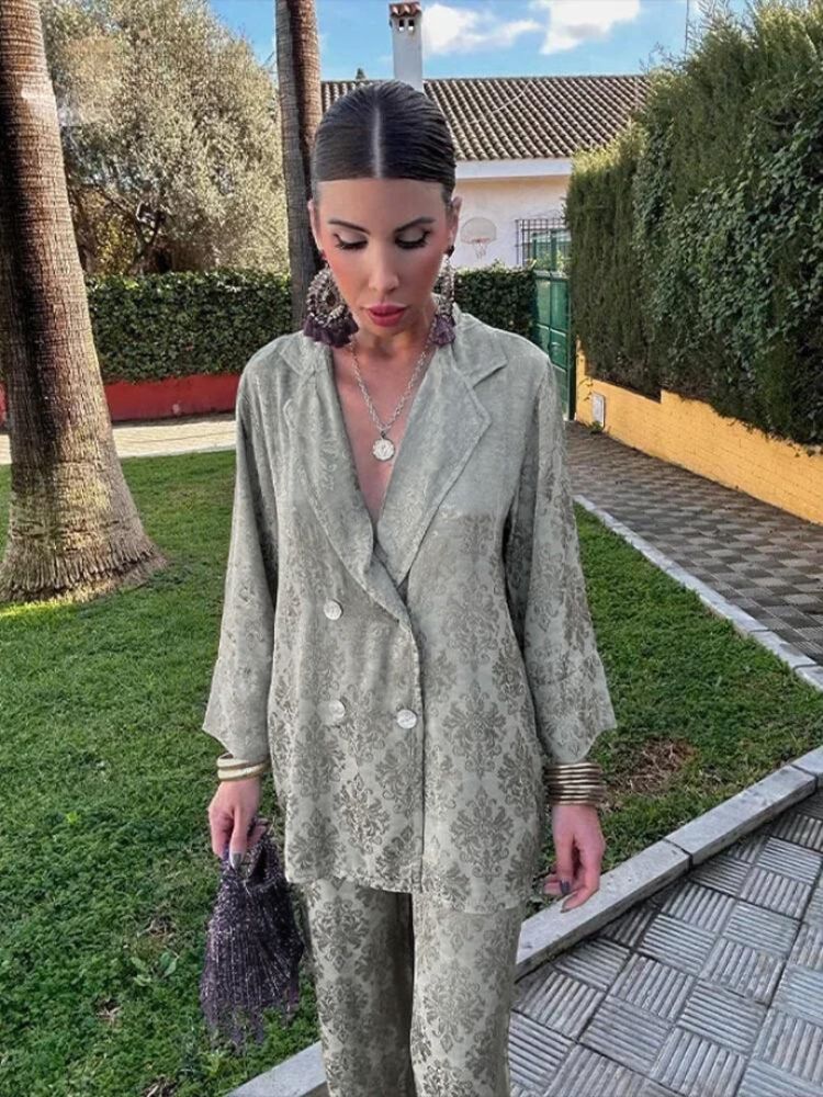 Dieses Set, bestehend aus einem doppelreihigen Blazer und einer Hose mit weitem Bein, eignet sich perfekt für formelle Anlässe oder stilvolle Abende.