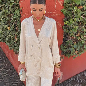 Das Delmi Jacquard Set aus luxuriösem Jacquard-Material besticht durch sein elegantes Muster. Der doppelreihige Blazer und die Hose mit weitem Bein sorgen für einen schicken, klassischen Look.