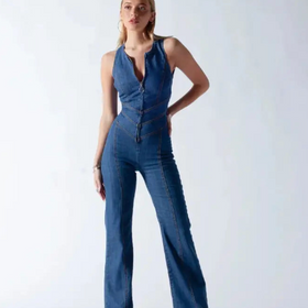 Setzen Sie ein Statement mit dem Hedwieg Backless Denim Jumpsuit!