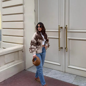 Diese cremefarbene und braune Strickjacke, ein echter Bestseller, verleiht Ihrer Garderobe Stil und Weichheit. Mit Puffärmeln und Streifenmuster ist sie komfortabel und vielseitig.