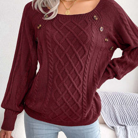 Bezaubernder Pullover mit langen Ärmeln, rundem Halsausschnitt und dekorativen Knöpfen. Gemütliches Strickmuster. Perfekt zu Jeans.