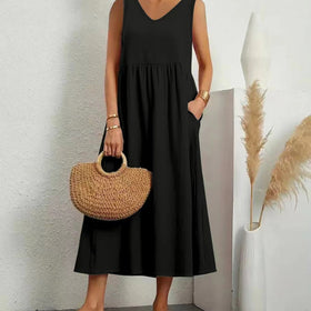Elegantes, einfarbiges Baumwoll-Leinen Sommerkleid von Fudus, ärmellos, V-Ausschnitt