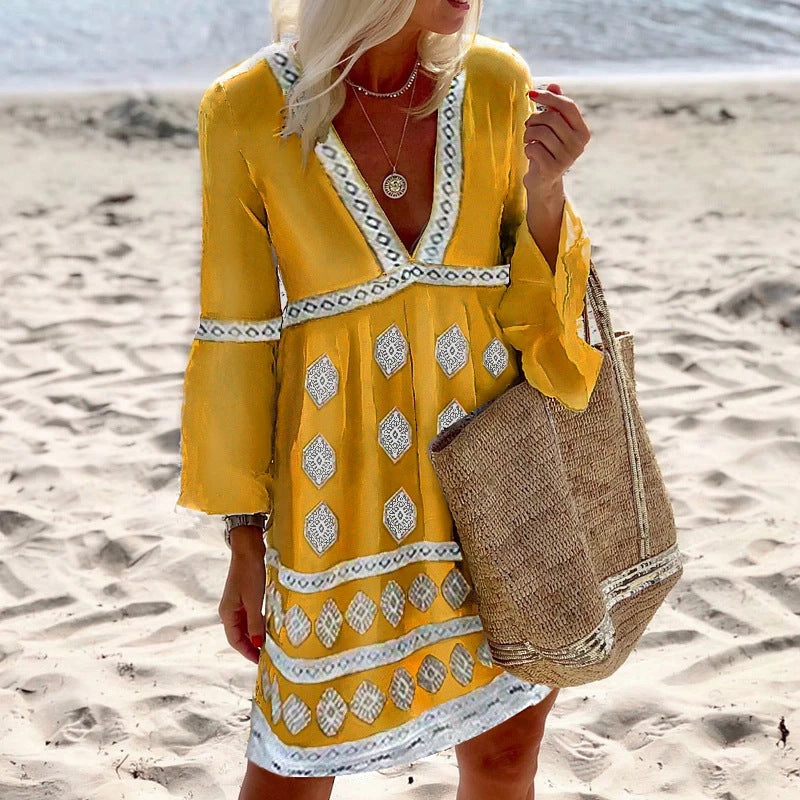 Glockenärmel, mittlere Taille, Einteiler, Midi-Rock, V-Ausschnitt, Dreiviertelärmel. Basis-/Pendelstil Kleid. Druck/Färbung.