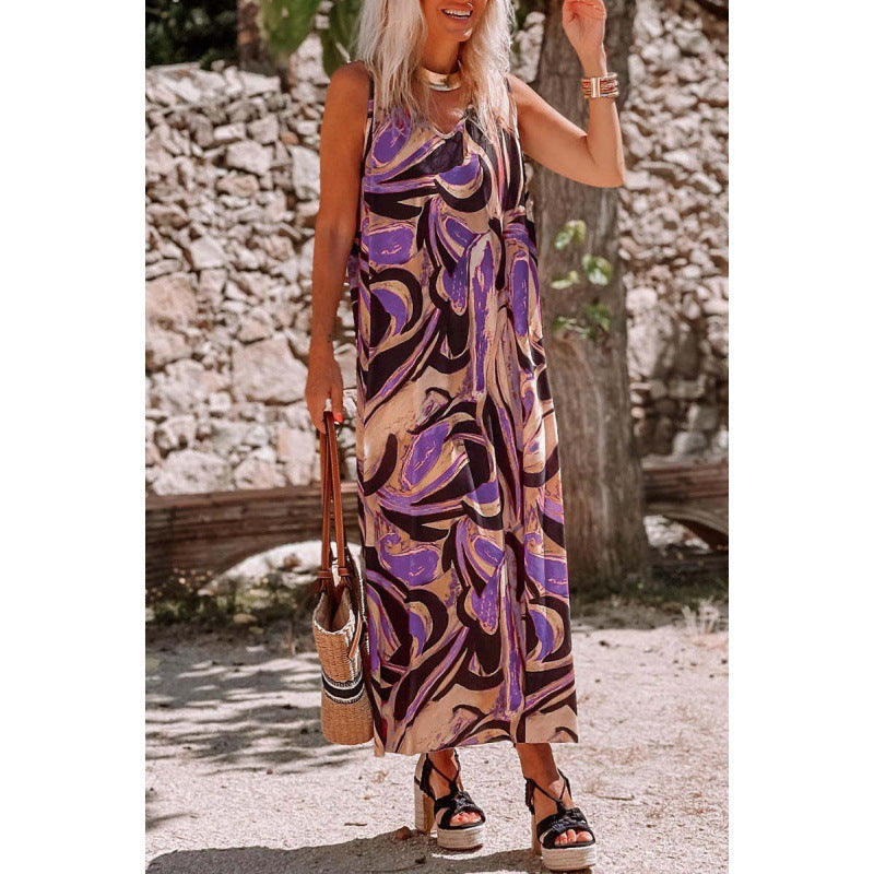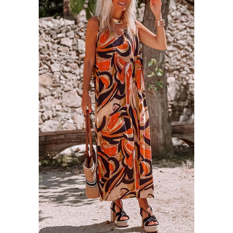 Urban Fashion Einteiler, Midi-Rock, V-Ausschnitt, Standardärmel, ärmellos. Bedrucktes Kleid.