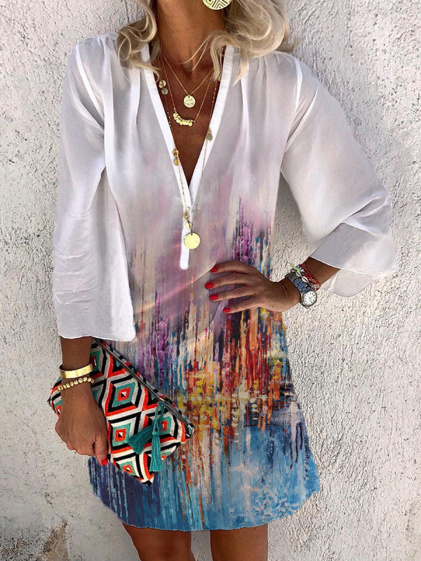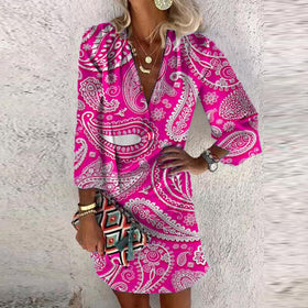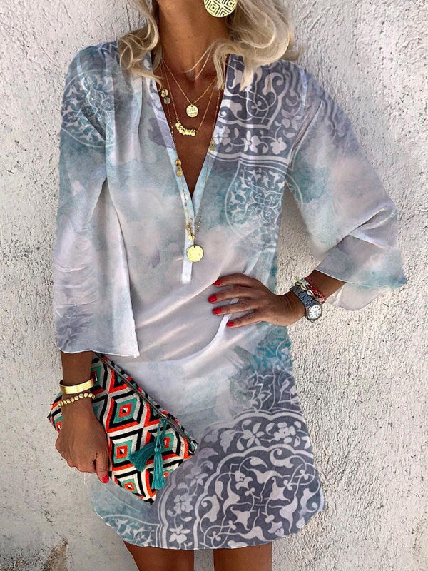 Fudus: Elegantes V-Ausschnitt-Druckkleid mit Dreiviertelärmeln