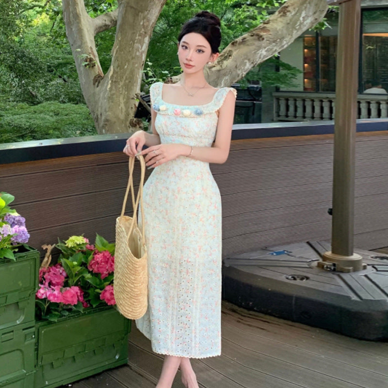 Elegante, gesellige Einzelstück. Langer Rock, rechteckiger Ausschnitt, rückenfrei. Sling-Back-Modell, Pullover-Verschluss, ärmellos. Sexystil, Patchwork-Handwerkskunst.