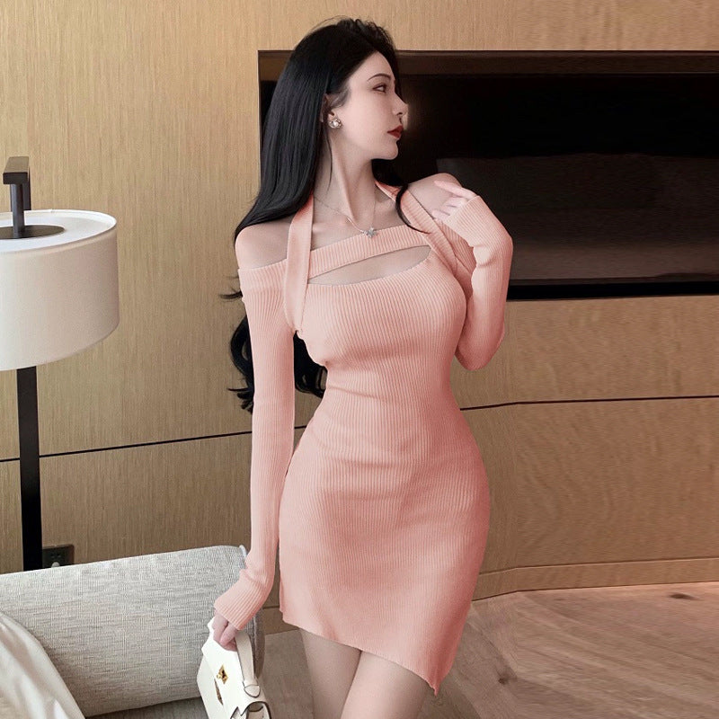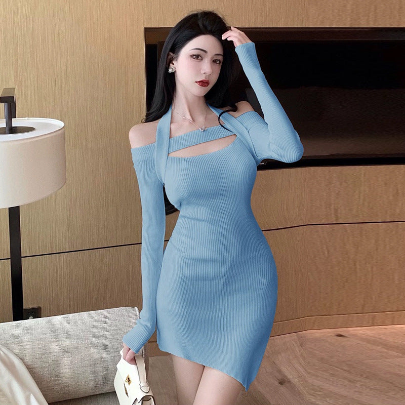 Privates Kleid Sozialeite. Einzelstück. Kurzer Rock, Halterneck, offener Rücken. Pullover, Langarm. Sexy Stil, Patchwork/Splicing.