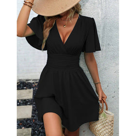 Eleganter Pendler Rock. Material: Spandex. Midikleid Länge. V-Ausschnitt. Falten. Rüsche Ärmel. Pullover Verschluss. Kurze Ärmel. Schnürung.