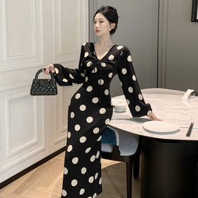 Gesellschaftliches Privatkleid. Einzelstück. Langes Kleid, V-Ausschnitt, Kordelzug. Grundstil, Pullover, lange Ärmel. Sexy Stil. Patchwork/Splicing.