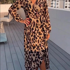 Fudus Langarmkleid mit sexy V-Ausschnitt und Leopardenmuster
