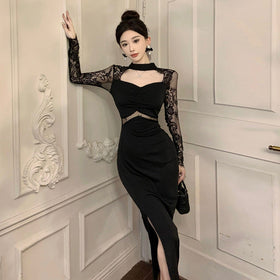 Privates Kleid (Einzelstück). Langes Kleid mit Halterneck und Schlitz. Basisstil, sexy, Pullover-Verschluss, lange Ärmel. Collage/Splicing.