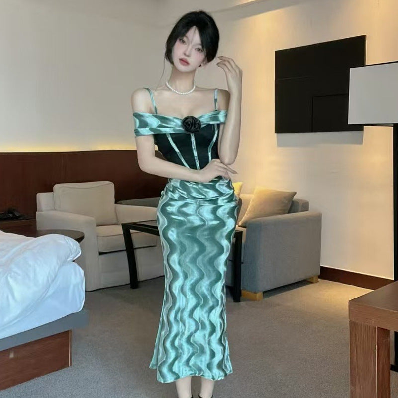 Maßgeschneiderte Private Lady Kleid. Einzelstück. Bodenlanger Rock. Off-Shoulder Design. Freier Rücken. Spaghetti-Träger. Keine Ärmel. Verführerischer Stil. Patchwork und Zusammensetzung.