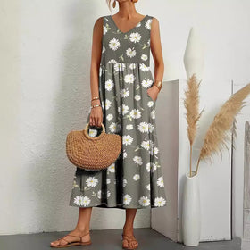 Fudus Sommerkleid: Elegantes, ärmelloses V-Ausschnitt-Printkleid mit Taschen