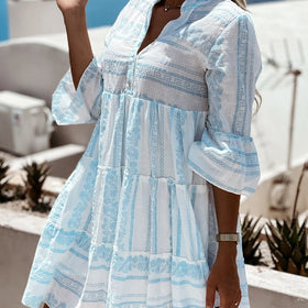 Das Ria - Schönes luftiges Boho-Kleid mit fröhlichem Muster bietet mühelosen, eleganten Look und maximalen Tragekomfort. Der lockere Schnitt und das leichte Material sorgen für angenehmes Tragegefühl, das verspielte Muster für frische, sommerliche Ausstrahlung. Ob am Strand, beim Stadtbummel oder auf Gartenparty – dieses Kleid bringt Leichtigkeit und Stil in Ihren Alltag. Die luftige Passform schmeichelt jeder Figur und macht es zum perfekten Begleiter für warme Tage.