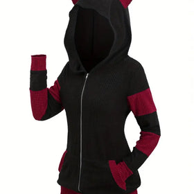 Keyviah Plus Size Zip-Up Cat Ear Hooded Jacket, Cute Color Block Long Sleeves