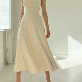 Das Kleid hat dicke Träger, die sich bewusst lässig, entspannt und bequem anfühlen. Ein Korsett in der Taille sorgt für eine flexible Größenanpassung und der Rock in Midilänge ist vollständig gefüttert.