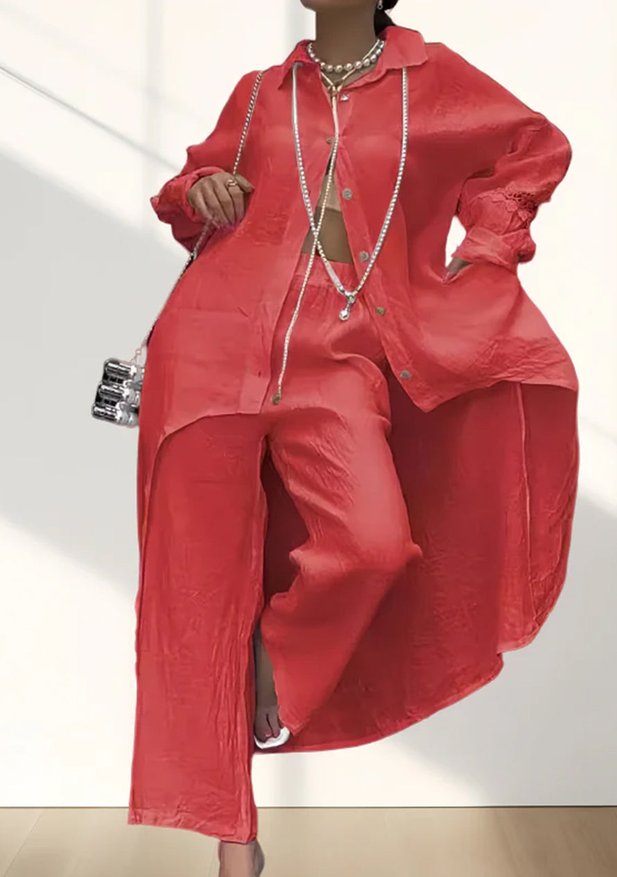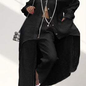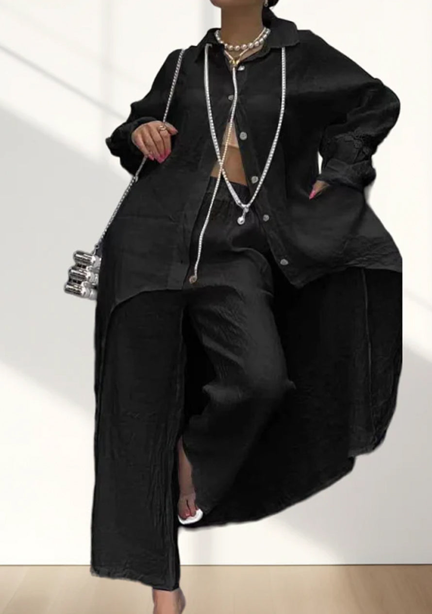 - Stilvolle Silhouette – Langärmliges Hemd und weit geschnittene Hose betonen Ihre Anmut.