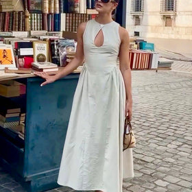 Dieses elegante Midi-Kleid verkörpert mühelose Klasse und unaufdringlichen Luxus. Der dezente Schlüssellochausschnitt mit zartem Knopfverschluss sorgt für ein raffiniertes Detail, während die definierte Taille und der Faltenrock eine schmeichelhafte Silhouette schaffen.
