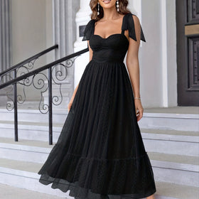 Klassische Eleganz mit zeitgemäßem Akzent. Schwarzes Kleid mit Herzausschnitt, filigranen, schulterfreien Ärmeln und mehrlagigen Rüschen am Rock.