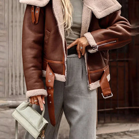 Die „Martha“-Jacke: Stilvoll und warm bei kühlem Wetter. Kunstleder, kuscheliges Shearling, klassische Flieger-Silhouette und Schnallenbeschläge vereinen Stil und Funktionalität. Perfekt zu Jeans, Strickpullover und Schal für einen Herbstlook.