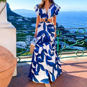 Das Dominika - V-Ausschnitt Schmetterling Maxi-Kleid bietet einen eleganten und verspielten Look. Der tiefe V-Ausschnitt betont Ihr Dekolleté, das Schmetterlingsmuster verleiht ihm Einzigartigkeit. Der fließende Stoff garantiert Bewegungsfreiheit und Komfort; die Maxi-Länge ist ideal für Festlichkeiten oder Sommerabende. Ein Blickfang für besondere Anlässe und den Alltag.