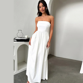 Dieses trägerlose Maxi-Kleid strahlt mühelose Eleganz und Raffinesse aus. Der schlichte, luxuriöse Look zeichnet sich durch minimalistischen Schnitt, hochwertigen Stoff und subtile Falten für einen anmutigen Fluss aus. Der trägerlose Ausschnitt betont die Schultern und verleiht einen zeitlos schicken Look.
